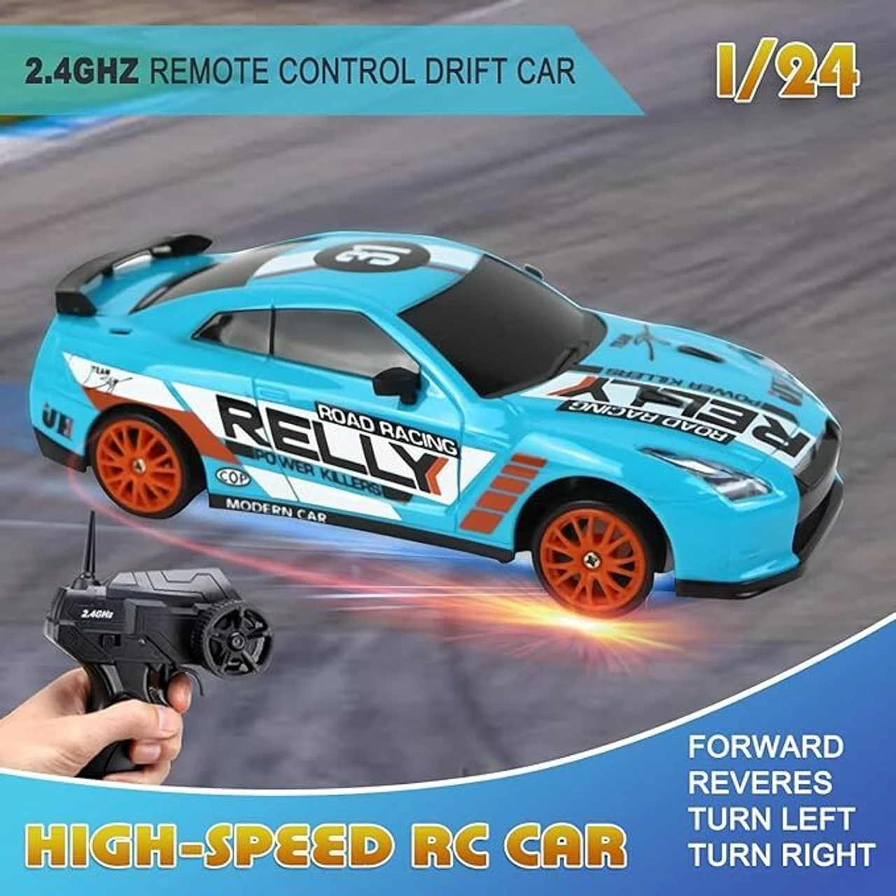 RIC Drift Returns SC24A08 is a high-speed 1:24 scale remote control drift racing car designed for exciting drifting action and fast racing. It features 4-wheel drive technology, powerful motor performance, and interchangeable tires for both drifting and racing modes. With bright LED headlights and responsive 2.4GHz remote control, kids can enjoy smooth drifting, sharp turns, and high-speed driving on smooth surfaces.