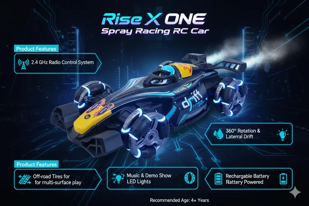 The Rise X Drift Extreme Speed RC Car is an exciting high-performance remote-control racing toy designed to thrill kids with drift stunts, water spray effects, lights, and sound. Powered by a 2.4GHz wireless system, it delivers smooth control, fast speed, and 360° rotation for non-stop action indoors and outdoors. This futuristic race car brings imagination and adrenaline together in one powerful toy experience.